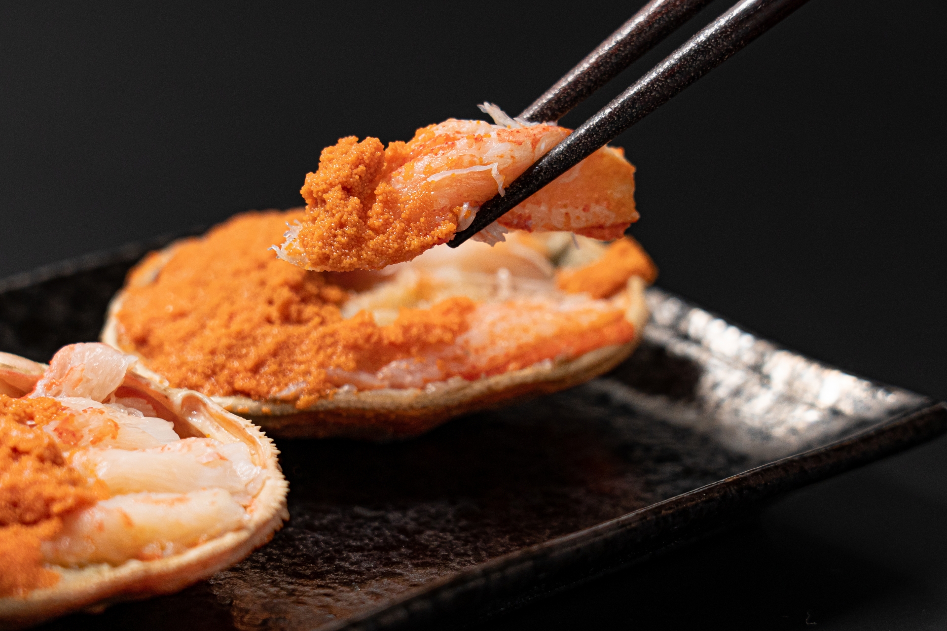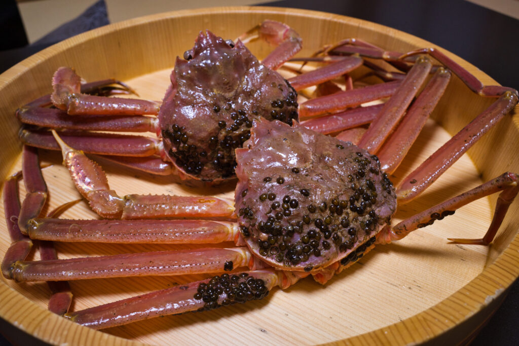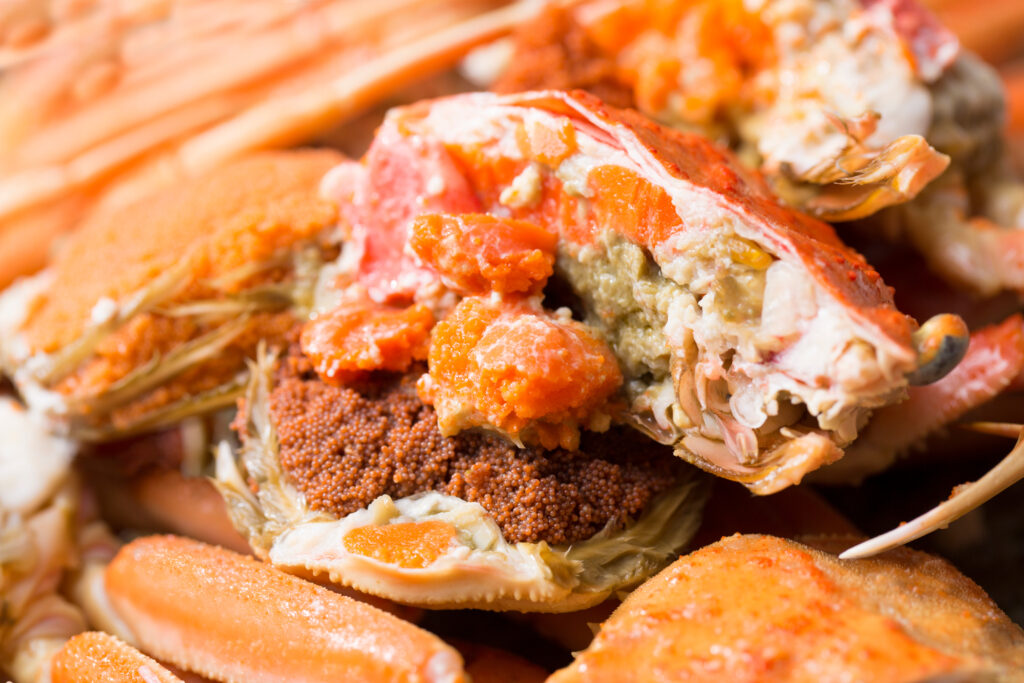 卵を抱えたメスで大きさは小ぶりですが、カニ味噌ぎっしりで、「内子(うちこ)」である卵巣は、「赤いダイヤ」とも呼ばれる至高の逸品!ぷちぷちした食感の外子(そとこ)も美味しく楽しめます。